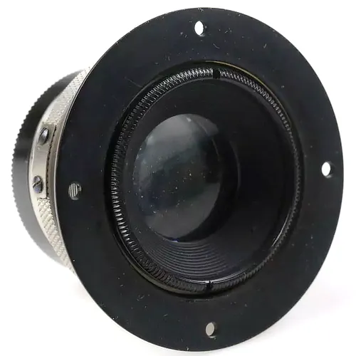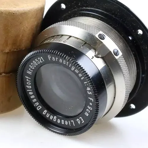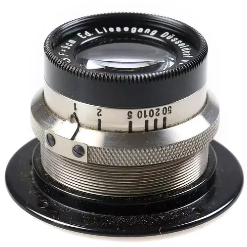 Enlarger lens marked “Ed. Liesegang Düsseldorf f=9cm”. Silver body. Black nose.