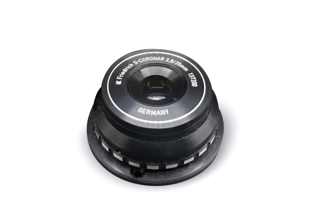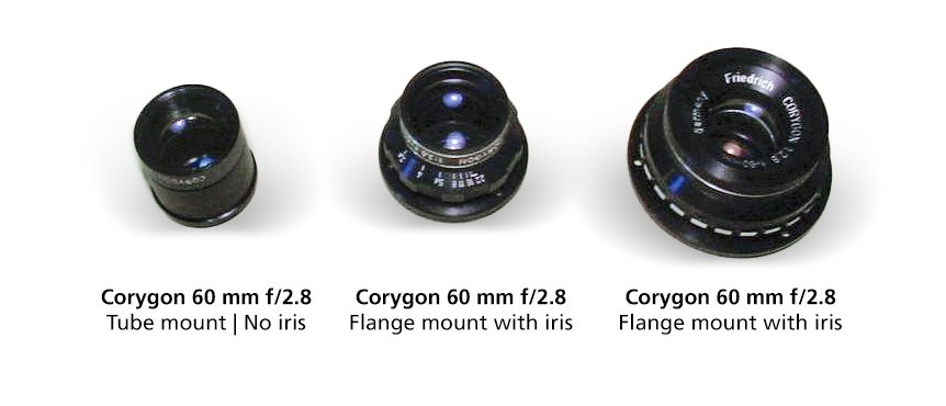 I was able to find out that Friedrich made this specific lens (and likely all of the other Corygon industrial lenses) in at least 4 different looking versions. While that is not unusual for bigger manufacturers of industrial lenses like Schneider Kreuznach, I’m quite surprised about this. Perhaps some might be simply redesigns but at least the 3 versions shown below seem to have been offered simultaneously, offering specific properties needed or beneficial for certain tasks.