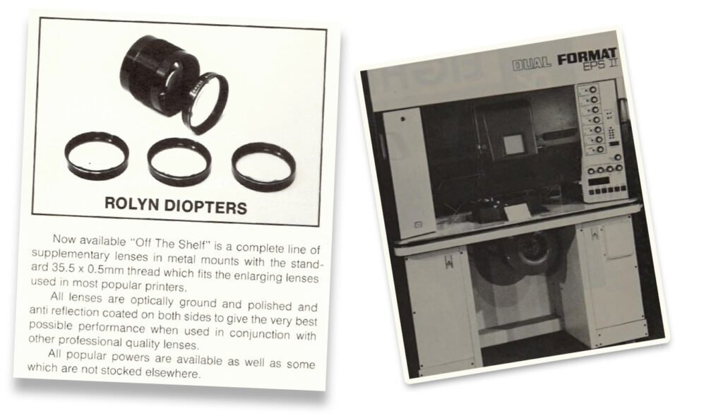 The Rolyn Optical catalog also contains some diopters for a lens which looks very similar to the Color-Coronar. The diopters are described as “…supplementary lenses (…) with the standard 35.5 x 0.5 mm thread, which fits the enlarging lenses used in most popular printers.”