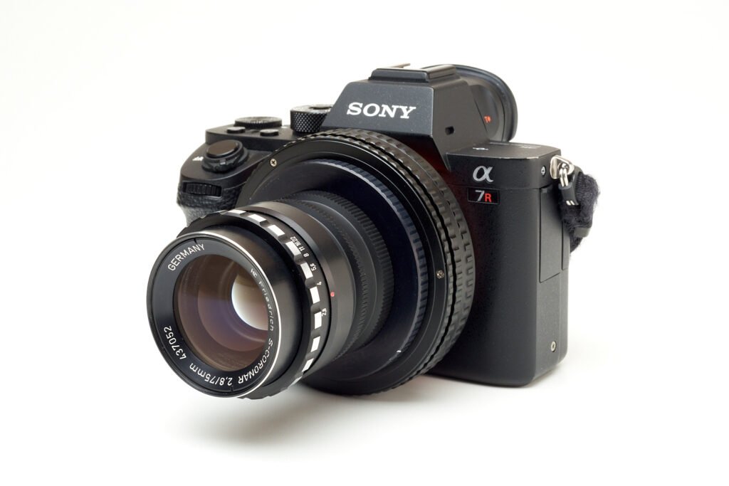 A word of caution: While you would expect a 75 mm enlarging type of lens to have a long focal flange distance allowing for easy adaptation, this one doesn’t have that feature and you might have to find a custom solution for adapting it properly, particularly with its unusual 60×1 mm thread.